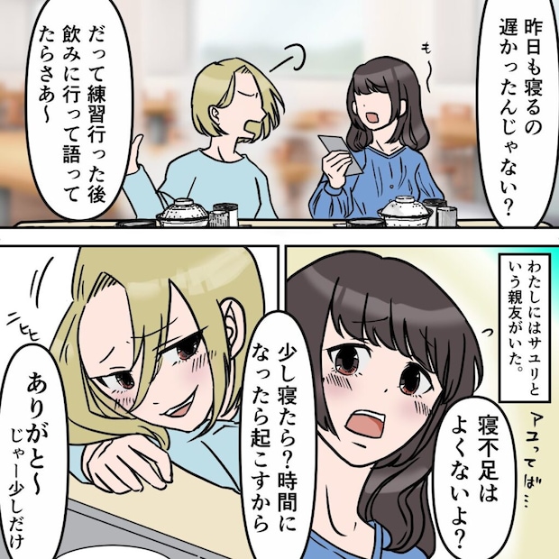 彼女の名前はサユリ。かわいくて、性格も良くて、守ってあげたくなるような女の子。軽音サークルの練習や飲み会で忙しかった私をいつもお母さんみたいに気にかけてくれて、一緒にいてくれました。