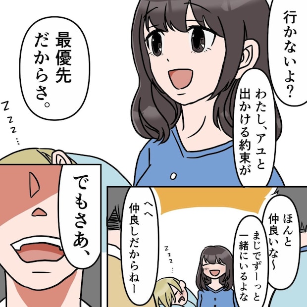 「アユも、毎日サユリとばっか一緒じゃ疲れるんじゃねーの?」と、サユリを誘いたい一心で言いました。サユリは珍しくその言葉に少し顔色を変えました。