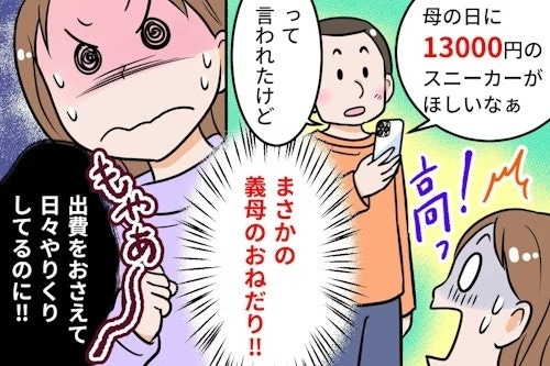 家族のため家計を守る妻にとって、予想外の出費は避けられるものなら避けたいですよね。アプリ「ママリ」には義母に1万円超えのプレゼントを要求されたという投稿がありました。夫に義母が、母の日のプレゼントとして1万円超えの靴がほしいと言ってきたそう。ちょうど出費が増える時期で家計もきついのに、こちらのことも気にせず要求してきた義母に困惑し、本当に買うべきか悩んでいるようです。