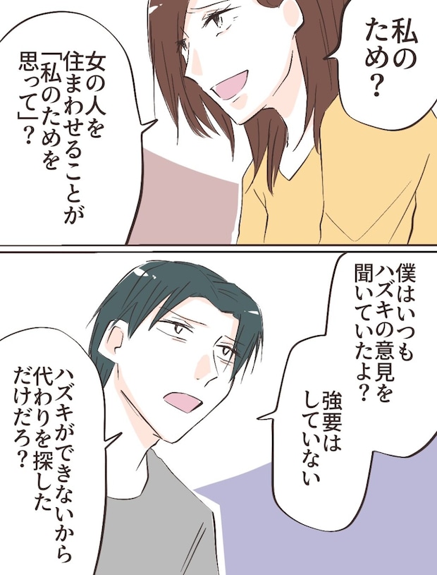 「私のため?女の人を住まわせることが『私のためを思って』?」と鼻で笑いながら言うと、「僕はいつもハズキの意見を聞いていたよ?強要はしていない。ハズキができないから代わりを探しただけだろ?」リヒトさんにそう言われて、