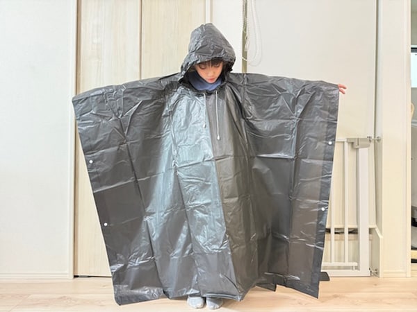 身長125cmの息子に目隠しポンチョを着せてみました。全身がすっぽりと覆われるほど大きいため、成人男性でも使えそうです。1セット550円なので、家族1人ずつに購入しても家計への負担が小さい点も魅力に感じました。