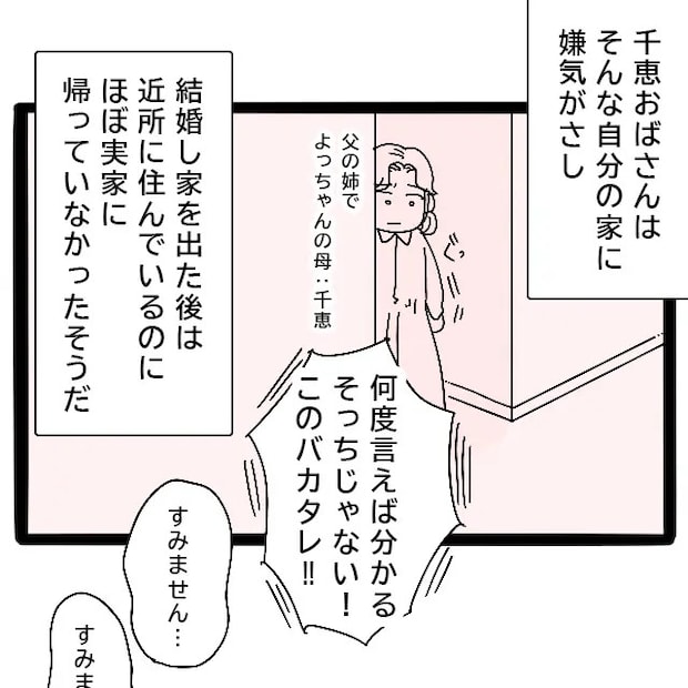 よっちゃんのお母さんの千恵おばさんは父の姉です。嫁いびりをする自分の母親と、それを止めようとしない父親や弟を見ていた千恵おばさんは、そんな自分の家に嫌気がさし、結婚して家を出た後は近所に住んでいるのにほとんど実家に帰らなかったそう。