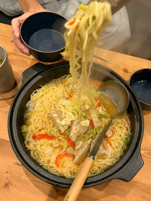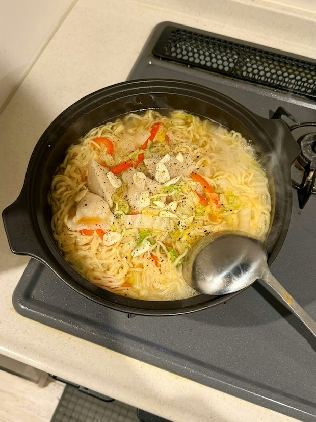 穴井メルさんは、塩焼きそば麺を使って塩ラーメンを作っていました。穴井メルさんが使った焼きそば麺の場合、ソース付きだったため、溶かすだけでスープができるのが時短となっていいですね。