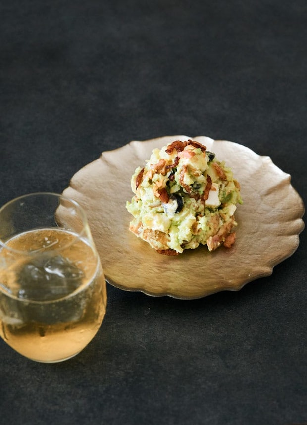 【1】ベーコンを細切り、クリームチーズを角切り、黒オリーブを輪切り、にんにくを粗みじん切りにする