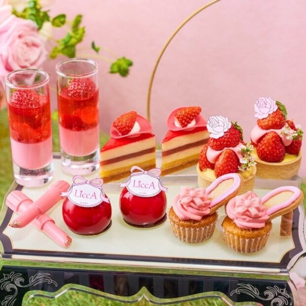 スイーツはいちご&ローズをたっぷりと。ハイヒールやリップスティックを模したスイーツも