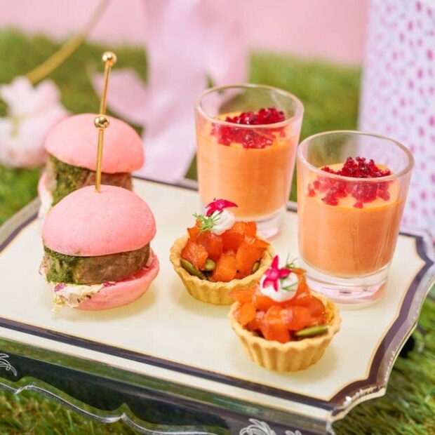 セイボリーは「パプリカムース ビーツクリスタルジュレ」、「グリーンミニバーガー ミントジェノベーゼソース」、「スモークサーモンのタルトレット」の3種類。ピンクや赤を基調とした華やかな彩りと、洗練された味わいが楽しめる。