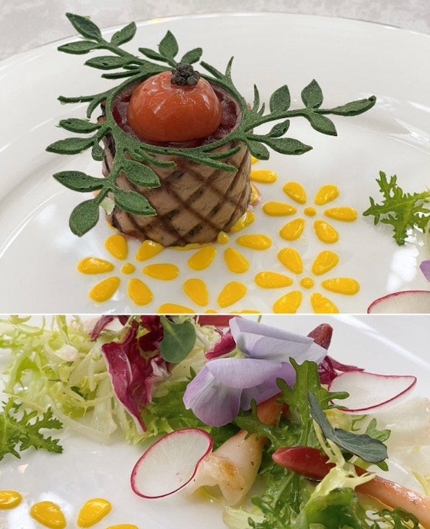 お花のように添えられたコクのある甘酸っぱいマヨネーズと、オマールコンソメのうまみやトマトの酸味を詰めたスフェリケーション、キャビアと北寄貝の爽やかなマリネがアクセントに。