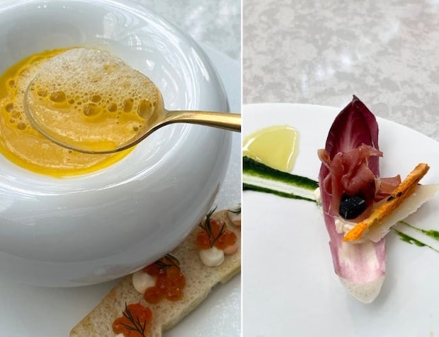 アンティーブの葉の苦みと、生ハムとパルミジャーノチーズの塩味とうまみが混じり、チーズエスプーマのふわっとまろやかな食感とクリーミー感に、サクッとしたトマトのパイ生地が絶妙に合わさった1品でした。