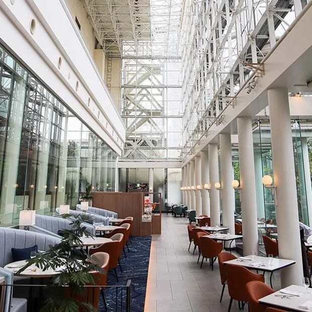 アマデウスは、四季を彩る自然の森に面したレストランです。すぐそばの池の水音、風を感じる3階吹き抜けの開放感あふれるアトリウム空間が魅力的です。