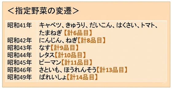 指定野菜に選ばれると何がよいのでしょうか? 野菜は天候や作況によって価格が大きく変動しやすいものです。指定野菜に認定されると、価格が著しく下落した際に生産者へ補給金が交付される「野菜価格安定対策事業」の対象となります。特定野菜よりも手厚い補助制度が適用されるため、産地が計画的に生産・出荷を進めやすくなり、結果として消費者にとっても安定した価格で手に入りやすくなります。