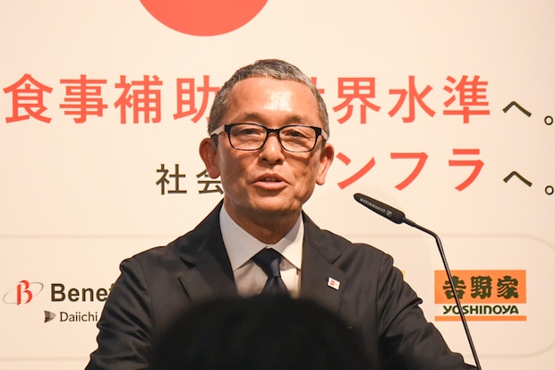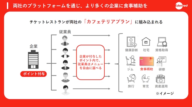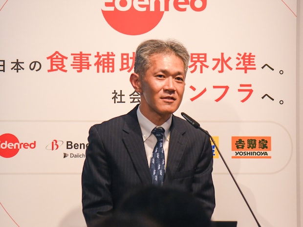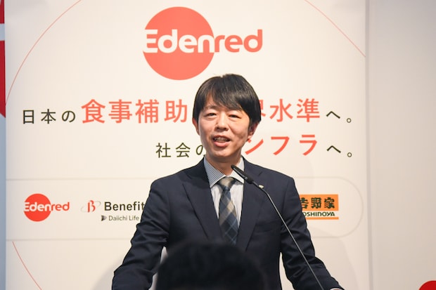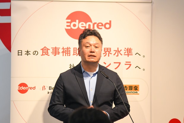 全国4千社以上に導入されている食事補助の福利厚生サービス「チケットレストラン」を運営する株式会社エデンレッドジャパンが3月30日、「食事補助非課税枠拡大に向けた連携発表会」を東京・六本木の同社本社で行った。今回の取り組みは、企業の食費補助に関する非課税限度額が月額3500円から7500円に引き上げられる今春の税制改正を受けたもの。当日は同社の天野総太郎社長のほか、連携先である株式会社ベネフィット・ワン、株式会社イーウェルの担当役員が登壇。また、同サービスの加盟店を代表して株式会社松屋フーズホールディングスと株式会社吉野家ホールディングスの担当者も出席し、実に42年ぶりとなる制度改正に向けて各社の期待と意気込みが語られた。