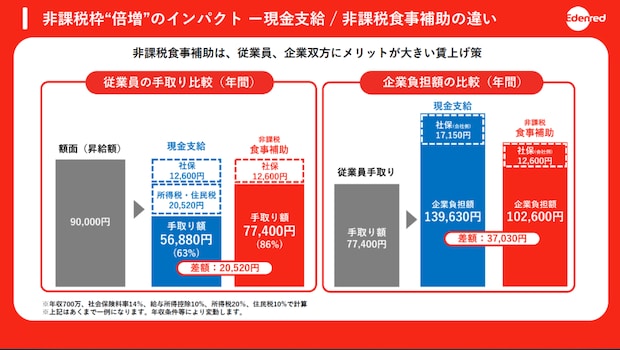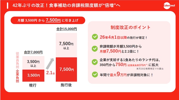 そもそも「食費補助」とは、企業が従業員の食事代の一部を負担する福利厚生制度のこと。社員食堂での食事、弁当の支給、食事用チケットなどの現物支給であること、食事の価額(食材の仕入れ額や弁当の購入額)の50%を従業員が負担していることなどが非課税になる条件であり、4月1日の税制改正では、これまで42年間にわたって3,500円で据え置きだった企業負担の限度額が7,500円に引き上げられる。これは月20日勤務とした場合、企業が支給する食事代が750円(うち、従業員負担375円)となる計算で、企業側は税負担を抑えながら従業員とのエンゲージメント強化が可能になり、従業員側は可処分所得の増加につなげられる。
