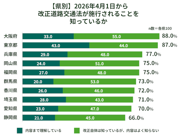 また、東京都や大阪府では内容の理解率が高い一方、岡山県や群馬県、愛知県、静岡県は20%台前半と、地域差が見られる結果となりました。