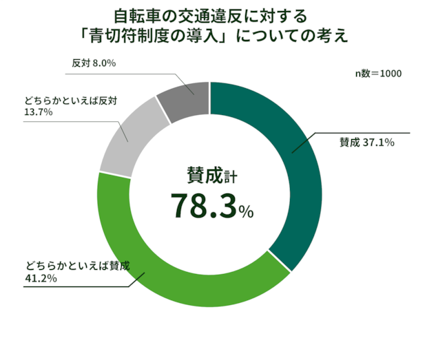 自転車の交通違反に対する青切符制度の導入について、「賛成」「どちらかといえば賛成」と答えた人は78.3%に達し、制度導入への支持は高い水準でした。制度導入の背景にある自転車マナー違反に対する社会的な懸念が高まっていることが推測されます。