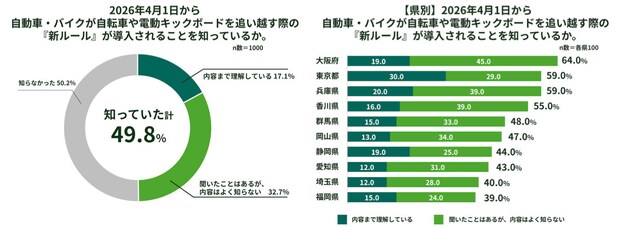 また、自動車やバイクが自転車・電動キックボードを追い越す際、十分な側方間隔を保つことを求める新ルールについては、認知が49.8%、内容理解は17.1%と低い理解率でした。