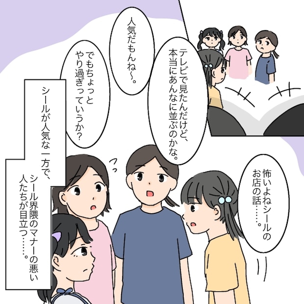 クラスの中であいちゃんたちのグループにもその話が聞こえてくると、「怖いよねシールのお店の話・・」と一人がそう言いました。「テレビで見たんだけど、本当にあんなに並ぶのかな」「人気だもんね~」「でもちょっとやり過ぎっていうか?」とみんな口々に言いました。そう、シールが人気にな一方で、シール界隈のマナーの悪い人たちが目立っていたのでした。