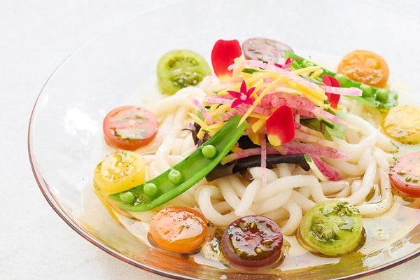 今回のイベントのために編成された限定コースの内容は、「はじまりのスープ」、「やさしいカプレーゼ」、冷たいうどん「Summer of Tomato(トマトスープの冷かけうどん)」と、