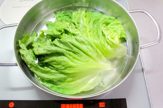 1. レタスをサッと茹でて水にとって冷まし、水気をしっかりと拭きます。