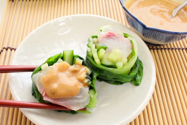 先に盛り付けたレタス巻きにゴマだれを添えたら完成です。