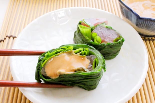 「マグロのレタス巻き」には青じそと青ねぎを入れます。こちらも両端をたたみ、手前からくるくると巻いて成形しました。2本とも4等分に切り分け、お皿に盛り付けておきました。