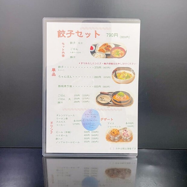 メニューは餃子とちゃんぽんをメインに、鉄板焼き飯やドリンク、デザートがあります。