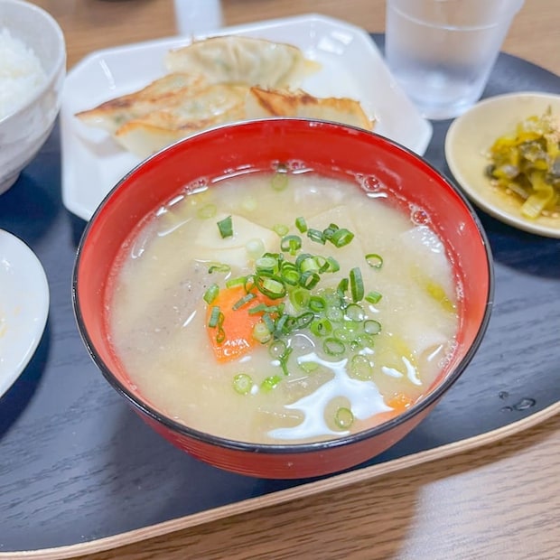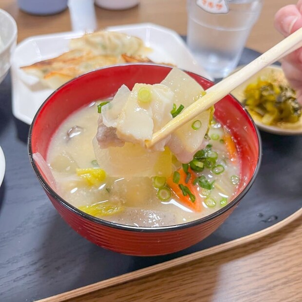 豚肉に里いも、大根、こんにゃくがゴロゴロ入っていて、食べ応え抜群です。お味噌の濃さも絶妙で、一口飲むたびにホッとする美味しさでした。