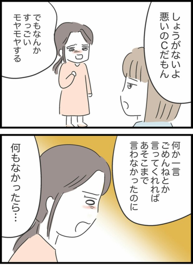 Cちゃんの前ではあんなにも強気だったAちゃんですが、すみれとBちゃんの顔を見るなり緊張の糸が切れてしまったのか涙を浮かべてしまいます。自分の言い方がひどかったのではと心配しているようですね。こんなにも話がこじれるとは想像もしていなかったのかもしれません。