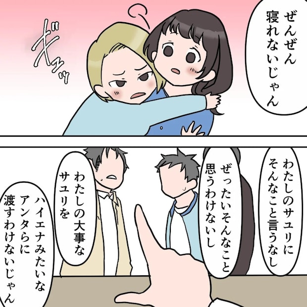 私はあくびをしながらゆっくり体を起こすと、「ぜんぜん寝れないじゃん」そう言いながら、サユリを守るようにギュッと抱き寄せました。そして男友達を指さし、「私のサユリにそんなこと言うなし!絶対そんなこと思うわけないし、大事なサユリをハイエナみたいなアンタらに渡すわけないじゃん」と、きっぱり言い切ります。