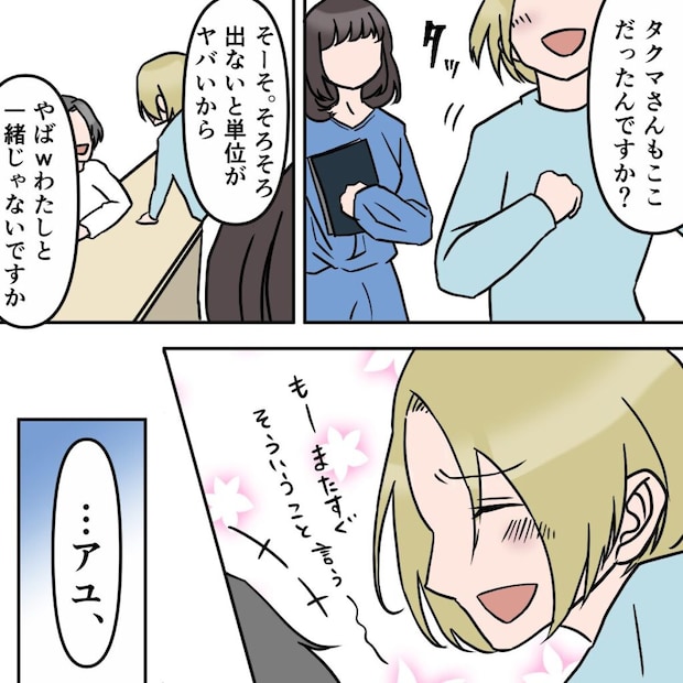 嬉しさのあまり、私は「タクマさんもここだったんですか?」と駆け寄り、ついサユリをそっちのけで話しかけてしまいました。「そろそろ出ないと単位がヤバいから」「私と一緒じゃないですか」タクマさんと楽しそうに話す私の様子を、サユリは無表情のままじっと見つめていました。