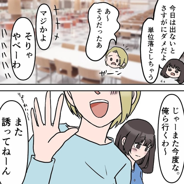 「今日は出ないとさすがにダメだよ、単位落としちゃう」サユリにそう言われて、私はハッと我に返ります。そうだった、今日欠席したら単位を落とすところだった。私は後ろでサユリが嬉しそうな顔をしていることにも気づかないまま、カラオケに向かう男友達を見送りました。
