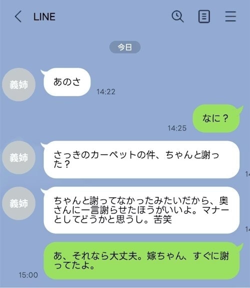 「カーペット汚したのに謝ってないから謝らせた方がいいよ」とLINEが来てイラッとしました。