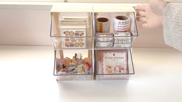 手前に傾いた透明な引き出しが特徴で、ロールメモやフレークシール、クリップのような、かわいい雑貨類の【見せる収納】にぴったり!取り出し口が大きいので、適当に入れても使いやすいのがポイントです。デスク以外では、キッチンなどで紅茶のパックやお菓子などを入れてもかわいくディスプレイできそう♪
