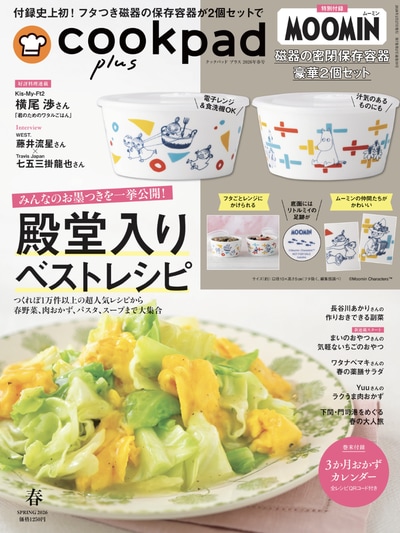 季節のレシピのほか、ちょっと素敵な暮らしの情報をお届けする季刊マガジン『cookpad plus』。2026年春号の巻頭特集は「殿堂入りベストレシピ」。クックパッドで大きな支持を集めた殿堂入りレシピ30品を大公開。つくれぽ1万件以上の超人気レシピから、新じゃがやアスパラなどの春野菜おかず、特売肉レシピ、パスタ&スープまで… 大好評レシピをぜひ味わってみてください。他、「長谷川あかりさんの作りおきできる副菜」「すっきり軽やかな体に!ワタナベマキさんの春の薬膳サラダ」なども紹介しています。