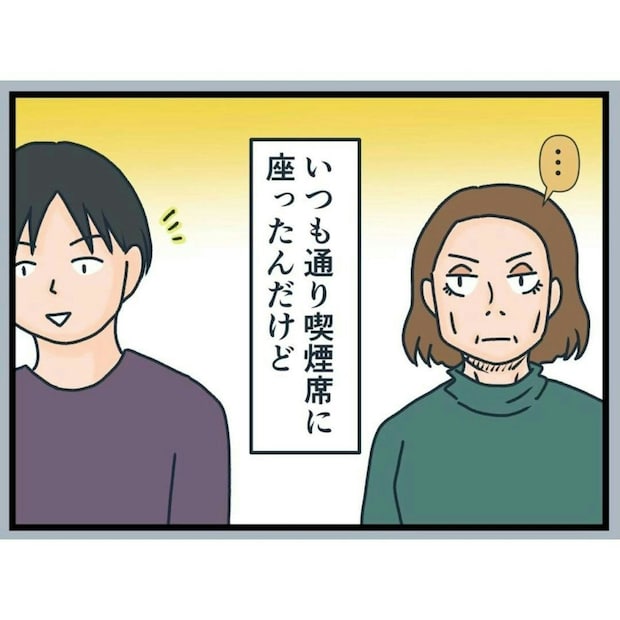 喫煙席でタバコを吸っている人に対し、せき払いやケムリを払う仕草をする、問句さん。マナーとしては、問句さんの方が禁煙席に移動するのが、常識的な行動ですよね。