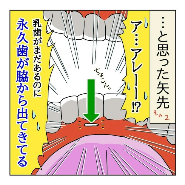 ようやく、歯医者さんの目星がつきました。ところが、乳歯が抜けるよりも先に、永久歯が生えてきてしまったのです…。
