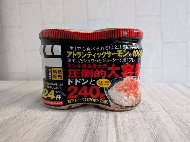 鮭フレークはスーパーでは意外と一瓶のお値段が張る「ちょっとした贅沢品」になりつつありますが、ドンキなら120g入り2瓶セットで755円。