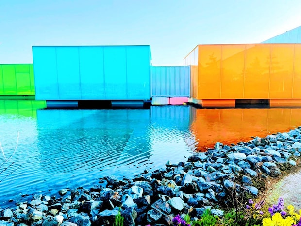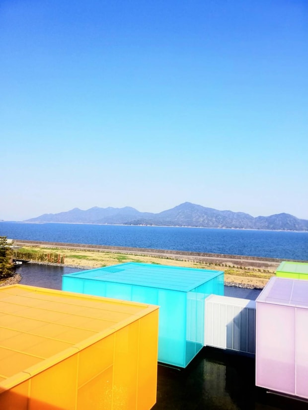 さて、次はどこに泊まろう? お気に入りのホテル検索サイトを何気なくスクロールしていたら、指が止まった。「うん、これって……?」。スマホの画面には見たことのない光景が広がっていた。水盤に浮かぶカラフルなキューブ。可動式展示室ですって? 美術館の外壁のミラーガラスには瀬戸内の穏やかな波と島々が映りこむ。「いや、でもここ美術館だよね?」。高速でスクロール、スクロール。「海辺の建築作品に泊まる」。そんな惹句を発見! なるほど、そういうことか。巨大な石油化学コンビナートを抱える広島県大竹市の海辺に2023年突如として姿を現したアート複合施設「SIMOSE」。世界的建築家・坂茂氏が設計デザインを手掛けた美術館、レストラン、個性豊かなヴィラがひとつの風景をつくりあげていた。これはもう即、予約。目指すは「Simose Art Garden Villa」。