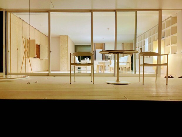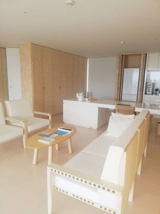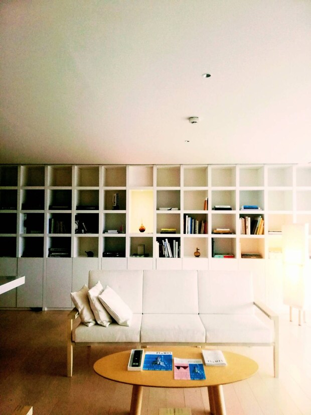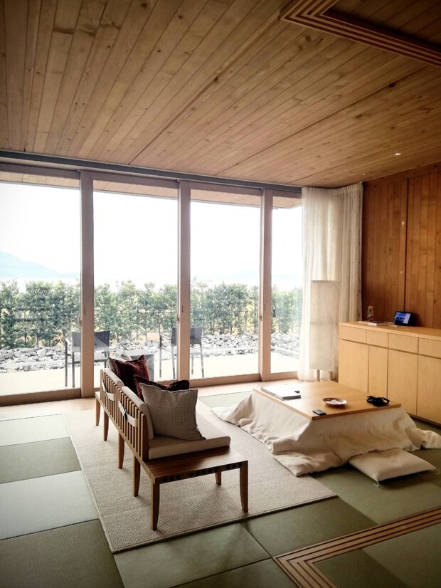 二度目に訪れたのは敷地の南側にある「森のヴィラ」。木立の中に坂氏がこれまでに手掛けた別荘建築をリメイクしたヴィラが立ち並ぶ。紙の家、ダブルルーフの家、十字壁の家、壁のない家……それぞれに個性があり、趣が異なる。すべて惹かれる。迷いに迷って選んだのは「家具の家」。クローゼットや本棚を、そのまま壁や柱の構造として使っているという。本棚に囲まれたリビング、掘りごたつのある和室、海を眺めるテラス。ほんとうに「暮らすように」滞在できる。全開口サッシで壁の中にすっぽり収まる窓を開け放つと、室内と外がそのままつながる。海風がすっーと通り抜けていく感じ。たまらない。