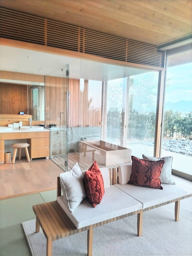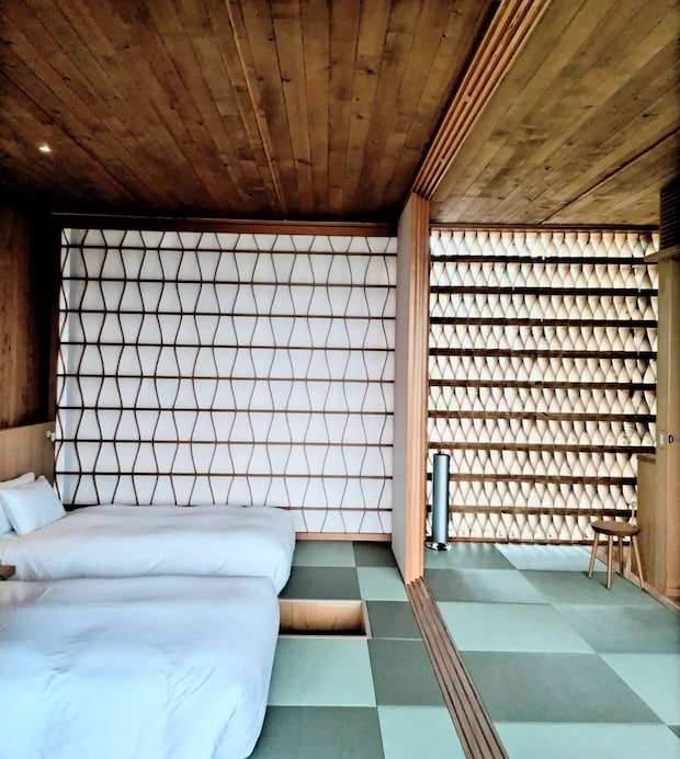 海岸線に沿って350mほど続く敷地内に足を踏み入れた途端、世界が変わった。宿泊エリアは、水盤に面した「水辺のヴィラ」と木々に囲まれた「森のヴィラ」の二つにわかれていた。結論から言うと、好みすぎて、どちらにも泊まってしまった。最初に訪れたのは、敷地の北側。海辺に広がる水盤に向かって五棟が並ぶ「水辺のヴィラ」。ゲストの再訪の愉しみのため、各部屋の内装は少しずつ違うのだという。私はヒノキの半露天風呂つきの和室タイプを選んだ。木製素材「キールステック」の透かし彫りのような断面が壁面に使われていて、差し込む光はさながら木漏れ日のよう。畳の上でうたた寝してみたり、海からの風とせせらぎの音を感じながら露天風呂に浸かってみたり、縁側を想わせる広いテラスにぼーっと佇んでみたり……。いつ、どの場所で寛いでも、目前に瀬戸内の景色が一幅の絵のように広がる。
