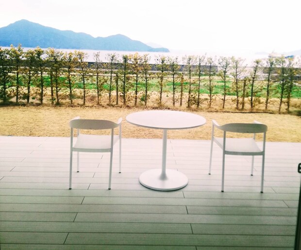 瀬戸内の穏やかな海と宮島が美しい。時間を忘れるテラス。