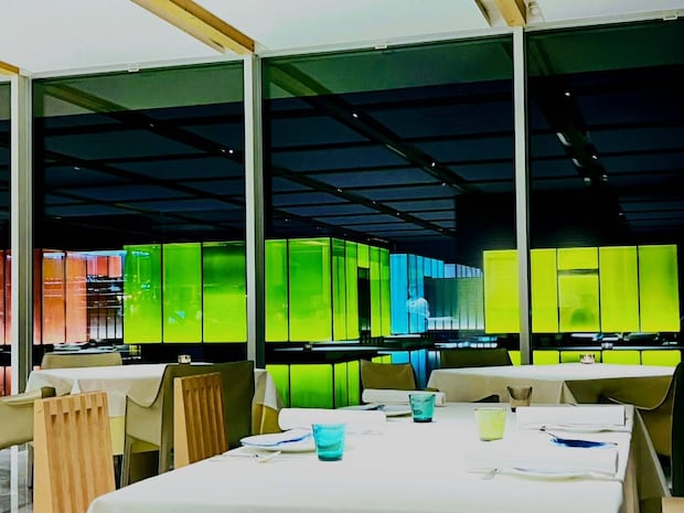 「アート オーベルジュ」。その名の通り「SIMOSE French Restaurant」では食事の時間までもがアート体験になる。オープンキッチンからは、シェフがフライパンを返す音や火が立ち上がる気配がそのまま伝わってくる。全開口の窓の向こうでは、瀬戸内の空と海がゆっくりと、だけど確実に表情を変えていく。広島産の肉や魚、有機野菜、柑橘など素材をまっすぐに生かしたフレンチ。香りが立ち上がって、地元の幸の存在感が伝わってくる。絵画のような一皿に舌鼓を打ちながら、ふと視線をあげれば窓の向こうに幻想的な風景が広がる。ついさっきまで見えていた山影や建物は闇の中に消え、ライトアップされたキューブが浮かびあがる。漆黒の水盤は鏡のように色ガラスを映し出す。「このキューブは瀬戸内の多島美に着想を得てつくられたんですよ」。グラスにワインを注ぎながら、スタッフが教えてくれた。宿泊者だけが見ることのできる「瀬戸内の夜景」。五感のすべてがひらいていく……。