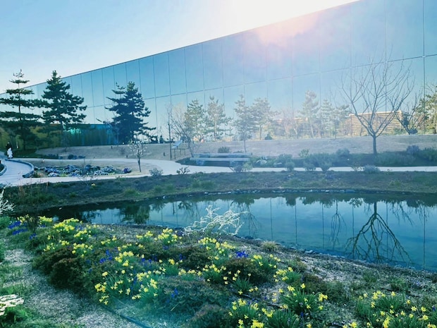 翌日、朝食を終え、レストランを出ると息を飲んだ。美術館のミラーガラスには、ゆったりと宮島が映し出されていた。海と空、山と緑。瀬戸内の自然の美しさが何倍にもなって迫ってくるのを横目にエミール・ガレの庭園へと進む。アール・ヌーヴォーを代表する工芸家で植物学者としても活動していたガレが愛した花々を朝の光が照らす。久しく忘れていた土の匂い。ここでもミラーガラスに樹々が映りこみ、森の中にいるような錯覚にとらわれる。さらに北側に歩を進める。望洋テラスピラミッド状に盛土された、なだらかな坂をあがっていくと、一面に瀬戸内の海が広がる。宮島、阿多田島、江田島などの島々とともに可動展示室も眼下に一望できる。風が頬を撫でていく。海の香り、輝く陽ざし。こんなに心地よい朝散歩は久しぶりだ。