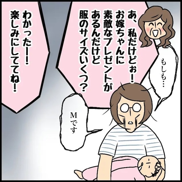 体力が限界に近いなか「もしも・・・」と生気のない声で電話に出ると、義母が間髪入れずに「あ、私だけどぉ!お嫁ちゃんに素敵なプレゼントがあるんだけど服のサイズいくつ?」と聞いてきました。私が絞り出すように「Mです」と答えると、「わかったー!楽しみにしててね!」と言って、あっさり通話は終了。