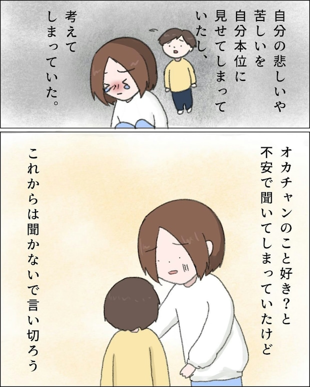 息子のみぃ君のイヤイヤにショックを受けると「自分は必要とされていない」と自己否定せずにはいられないねむりひつじさん。周囲のアドバイスを通して、自分の思考の根底に幼少期に感じた「寂しさ」があり、みぃ君もそう感じているはずだと思ってしまっていることに気づきました。