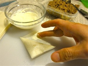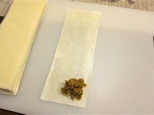 春巻きの皮で具を三角に巻く