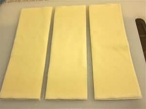 1. まず春巻きの皮10枚を、それぞれ3等分に切ります。このあと、一気に30個のおつまみに大変身します。
