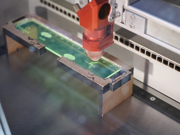 しばらくすると、機械の奥でスイッチがそっと入ったように、「チチチ」「スーッ」という細やかな音を立てながら、レーザー加工機が静かに動き始めました。