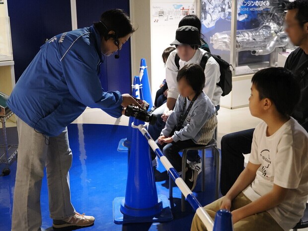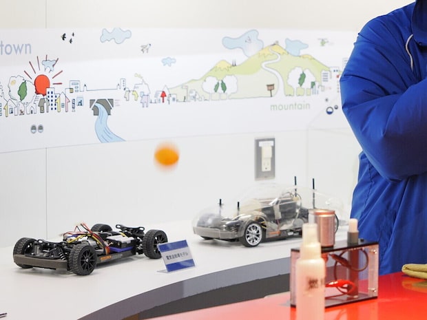 ここではラジコンカーを使ってその流れをイメージしながら説明を受け、音が静かで走行中に二酸化炭素を排出しないといった電気自動車ならではの特徴も理解できます。
