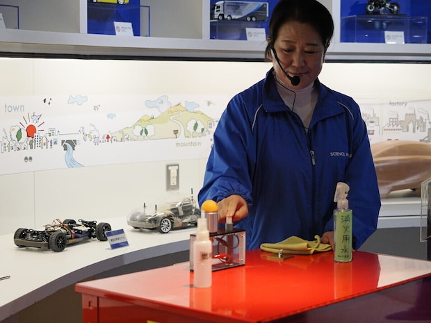 最初に見せてもらったのは、身近な「ガソリン車」がどうやって動くのかを、ミニ実験で体感できるコーナー。筒の中に入れたエタノールに火花を点火した瞬間、内部の空気が一気に膨らみ……