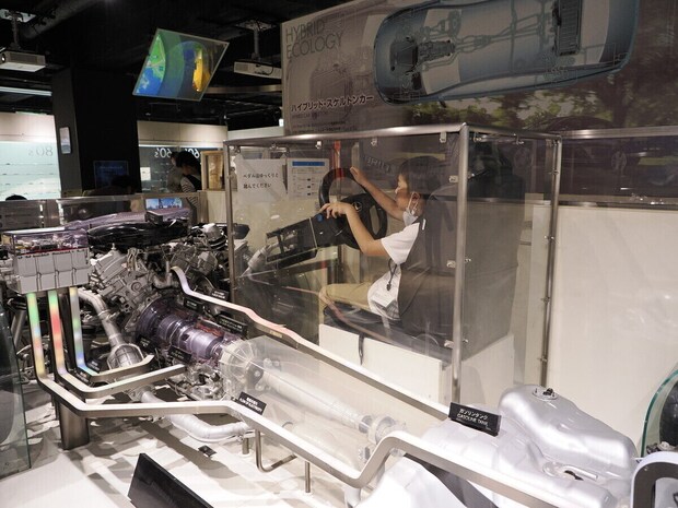そして、ガソリンエンジンとモーターを切り替えながら、効率よく走るための工夫がつまっているのがハイブリッド車。その中身を“丸見え”で教えてくれるのが、すぐ後ろに展示されている「ハイブリッド・スケルトンカー」です。